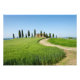Foto-impressão de uma estrada de curva que atravessa as culturas de cereais em direção a uma vila fazenda com uma fila de árvores ciprestes à sua frente, perto de Pienza, no Vale de Val d'Orcia, na Toscana, Itália.