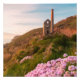 Wheal Coates, antiga casa de motores. Minério de estanho de 1802 a 1889. Costa da Cornualha, perto das Ruas. Linha costeira robusta na costa norte da Cornualha, Inglaterra. Flores cor-de-rosa, cor-de-rosa, na flor do cheio, com um céu azul nebuloso no fundo. Pintura original, reprodução digital.