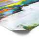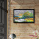 A vibrant landscape showcases a lake surrounded by lush greenery under a dramatic sky. Rich hues of orange, green, and blue blend to depict the interplay of light during a sunset. The serene scene portrays the beauty of a natural setting in an impressionistic style.