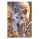 Um Lobo das Cinzas-mãe e o seu filhote de 6 meses atravessam a cortina laranja e dourada. O arco do sol se curvou até a órbita do outono, a luz filtrada atinge as folhas líquidas das árvores âmbar que se rompem com cores sazonais laranja e amarela.