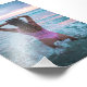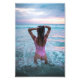 A woman in a pink swimsuit stands waist-deep in the ocean as waves splash around her. The sky is a blend of pastel colors at sunset.
