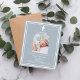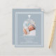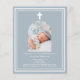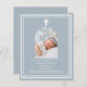Fundo azul empoeirado, decorado com um quadro branco, e uma cruz branca Personalize e adicione um nome de foto e detalhes. Texto branco. Quadro fotográfico em forma de arco. 1 folha = 1 convite impresso de borda a borda.