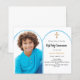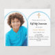 Adicione sua própria foto de tamanho vertical. Um arco azul-céu moldou quadro fotográfico. Uma cor branca de fundo. Personalize e adicione um nome e detalhes. 1 folha = 1 convite impresso de borda a borda.
