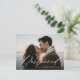 Precisa alterar a data do seu casamento? Nossos elegantes cartões-postais de adiamento de casamento são perfeitos para ajudá-lo a notificar os convidados da sua nova data de casamento. O cartão-postal de alteração de data apresenta "Adiamento" em uma sobreposição de texto em caligrafia branca com sua foto de noivado horizontal. Personalize o cartão-postal adicionando seus nomes, endereço de devolução, detalhes do casamento, site do casamento, etc.