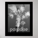 tropics fotografia poster a preto e branco de palmeiras com paraíso de texto em letras brancas, disponível como 8 x 10 ou 16 x 20 wall art. A arte original e a fotografia de Ann Powell sobre posters e artes de parede. Direitos autorais da fotografia Ann Powell todos os direitos reservados.