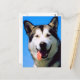 Este cartão postal tem uma foto colorida adorável de um cachorro husky ofegante com a língua para fora.