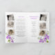 Ordem funerária de serviço de dupla face floral roxo delfinium watercolor programa de arte com flores roxas e folhas verdes em branco. Basta substituir o texto de exemplo e os suportes de fotos brancos com estrutura branca e estilo instantâneo e o quadro fotográfico flexível na frente por suas próprias fotos especiais e detalhes de informações. Pintura botânica originalmente delfinium color e design por Sarah Trett para www.mylittleeden.com (fotos são apenas imagens marcadoras para você substituir por suas).