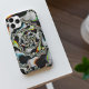 Esta capas de iphone apresenta uma arte fractal espiral abstrato e psicodélica a preto e branco com sotaques amarelos, cor de laranja, azuis e verdes.