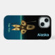 Uma imagem fractal em tons castanhos sugerindo um caçador Inuit altamente estilizado, vestindo roupas tradicionais de pele, segurando um arpão com cabeça de marfim. A imagem é sobreposta a um fundo que representa o inverno polar escuro. A leitura de texto "Alaska" também aparece em azul e branco brilhantes. Personalize adicionando seu próprio texto adicional.