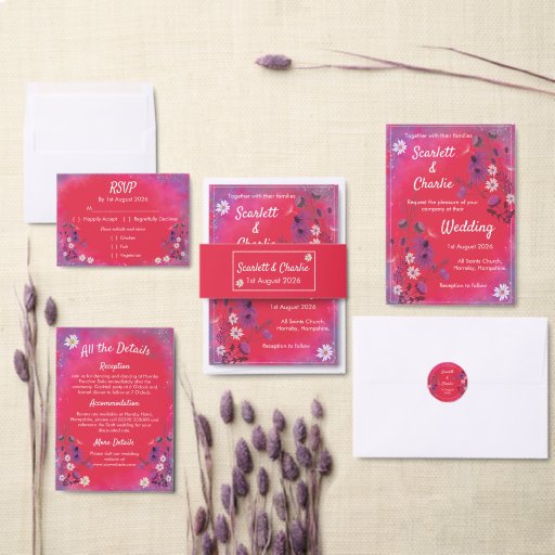 Design cor-de-rosa de framboesa com mão vibrante com flores silvestres para papelaria de casamento - convite para o casamento