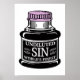 Uma pequena garrafa de vintage, rotulada "Sin-World's Finest" não diluído. Um design preto e branco com um pouco de lilás no boné da garrafa. Você é malicioso o suficiente para beber ou oferecer? Enfim, é à prova de culpa, doce e sujo...