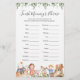 Os animais Safari têm o cartão de jogo de final de mamãe com o tema chá de fraldas e ilustração de berçário com cor d'água e verde-d'água eucalyptus garland e uma elegante letra de estilo manuscrito.
