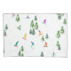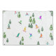 Arte legal de ilustração branca de snowboarders coloridos, descida de snowboard em montanhas entre pinheiros, spruce, árvores de abeto sobre pó fresco de neve. Snowboard e xmas esporte ao ar livre numa floresta de inverno. Dons do Snowboarder. Decoração de Natal de Snowboard.