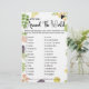 Fresco do Jogo de Tradição de Casamento de Mercado | Chá de panela Divertido Trivia Teste seu conhecimento sobre os costumes matrimoniais com nosso jogo de tradições de casamento "Fresco do Mercado"! Este jogo envolvente e informativo é uma adição perfeita ao mercado, jardim ou chá de panela temático rústico de seus agricultores. Com os nossos produtos desenhados à mão e os deliciosos florais de aquarelas, ele complementa lindamente a sua estética natural e fresca. Aqui está como jogar: os convidados recebem um cartão de jogo com perguntas sobre a história, significado ou origem de várias tradições de casamento de todo o mundo ou ao longo da história. Escrevem as suas respostas, e depois o anfitrião revela os fatos corretos. É uma maneira fascinante de aprender trivialidades divertidas sobre costumes de casamento, despertar conversas e competição amigável entre convidados! O cartão de jogo "Tradições de Casamento" oferece perguntas claras e espaço para os hóspedes escreverem suas respostas em uma design atraente, temática. É uma atividade fácil de distribuir no mesa, fornecendo fatos interessantes e entretenimento. Coordene este jogo educacional perfeitamente com outros itens da nossa coleção "Fresco do Mercado", como convites, outros cartões de jogo e cartazes, para um tema de evento belamente coeso e divertido. Personalize facilmente o cartão de jogo adicionando o nome da noiva, a data do evento ou ajustando potencialmente as perguntas (dependendo dos recursos de modelo do Zazzle). Disponível impresso em estoque de cartão premium ou como um conveniente download digital impressão in-home. Clique em "Personalizar agora" para personalizar o seu jogo de Tradição de Casamento Fresco fora do Mercado e adicionar um toque de trivialidades interessantes e diversão ao seu chá de panela! jogo de tradições de casamento, trivialidades de chá de panela, jogo novo fora do mercado, atividade de noiva do mercado de fazendeiros, jogo de casamento rústico, jogo de festas de jardim, jogo de costumes de casamento, jogo de jogos de chá floral