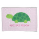 A tartaruga cor-de-rosa e verde personalizada caçoa a fronha de almofada do quarto. Caixa bonito do travesseiro para a sala de crianças com animal dos animais selvagens. Decoração home feita sob encomenda para a criança. Adicione seu próprias citações ou monograma conhecido, engraçado. Design da ilustração do tema do safari para o filho, a filha, o neto, o sobrinho, o design neutro do género do neto etc. para o menino ou a menina. Fundo feito sob encomenda da cor atrás dos polkadots. Impressão pequeno do teste padrão de bolinhas. Ideia do presente do aniversário ou do Natal do divertimento.