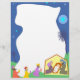 Os três reis visitando o bebê jesus deitado em uma mangueira com seus pais Mary e Joseph assistindo. Belo design de borda de página de Natal.