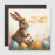 Ein niedlicher Osterhase mit einer Blumenkrone sitzt liebevoll inmitten bunter Ostereier. Em seinen Pfoten hält er ein kleines Weidenkörbchen mit bemalten Eiern. Die Szene ist von zarten Frühlingsblumen und warmem Licht umgeben. Über dem Hasen leuchtet in fröhlichem Orange die Aufschrift "Frohe Ostern"- ein herzlicher Gruß, der die Leichtigkeit und Freude des Frühlingsfestes einfängt.