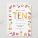 Tenha uma festa de aniversário tropical 10ª para a sua pequena! Este adorável convite de aniversário cor-de-rosa-frutado apresenta fruta de aquarela, incluindo abacaxi, melancias, laranjas, cerejas e morangos. Todos os detalhes, incluindo (exceto idade), são personalizáveis. Outras idades também disponíveis nesta coleção, ver abaixo...