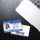 Este Crachá de identificação moderno apresenta uma bela malha azul, foto, logotipo e código de bar. Facilmente personalizável.