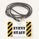 Este design de crachá apresenta um padrão listrado preto e amarelo, juntamente com a mensagem "FUNCIONARIOS EVENT" (EVENTO). Talvez pudesse ser utilizado para identificar as pessoas como trabalhadores de um evento.