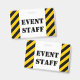 Este design de crachá apresenta um padrão de listras pretas e amarelas, juntamente com a mensagem "FUNCIONÁRIOS DO EVENTO". Poderia ser usado para identificar pessoas que trabalham para os operadores de um evento.