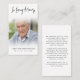 Funeral Moderno No Cartão De Oração Fotográfica De Memória Adoradora. Mantenha a memória de um ente querido perto com este cartão de oração personalizado com uma foto tesourada, o título EM MEMÓRIA DE AMOR, o nome e as datas e uma mensagem editável de lembrança do coração. Com o seu clássico design preto e branco e o seu moderno guião manuscrito, ele faz um importante esforço para partilhar num funeral, num serviço de memorial ou na Celebração da Vida e oferece conforto e um tributo duradouro à família e aos amigos. Seu pequeno e portátil tamanho de 3,5x2" (tamanho de carteira) torna conveniente que os entes queridos o carregar com eles como um lembrete da vida e do espírito de seu ente querido.