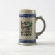 A gray and blue ceramic beer stein with a funny Irish humor quote about not being able to drink bacon.