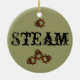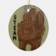 A palavra Steam na parte de trás e na frente deste ornamento. A frente também contém a minha ilustração do Furnace Steampunk, ah doce vitoriano que parece monstruosidade de uma máquina. Há também algumas engrenagens nas costas.