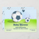 Um convite de chá de fraldas de futebol/futebol. O convite mostra uma bola de futebol azul e uma bola de futebol de bebê azul, grama verde e um céu azul. Todas as palavras podem ser personalizadas.