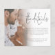 Gabinete de Detalhes de Casamento de Código QR de Foto de Orçamento. Um alternativo de 4,5 pol x 5,6 pol com preço inferior. Disponível em um STOCK DE CARTÃO SEMI-GLOSS 110 lb, que é a opção padrão (mais espesso para convites), OU um STOCK de PAPEL THINNER FINISH 80 lb FINISH (ideal para gabinetes). Adicionar seu código QR ao seu site de casamento no verso faz com que esta seja uma opção conveniente para seus convidados verem todos os detalhes. Você pode criar códigos QR gratuitamente on-line. Basta pesquisar "Criador de código QR" e muitas opções surgem para criar gratuitamente. Um design minimalista para que todos saibam suas boas notícias. Basta substituir o exemplo de foto pelo seu favorito. Uma camada de camada de gradiente está sobre a sua foto, de modo que ela desaparece à medida que ela chega ao centro com o texto parcialmente sobreposto no topo. Os Detalhes estão em um script moderno e personalizam facilmente o resto do texto.