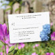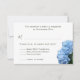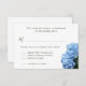 Cartões RSVP de casamento floral azuis com seção de menus. Completamente personalizável, este pequeno cartão branco tem uma flor azul clara e realista no canto. O texto impresso na parte superior e inferior pode ser personalizado conforme necessário para o seu evento. O reverso é branco. O papel pode ser atualizado para criar uma aparência mais elegante. Esta é parte da linha de design do céu azul em Bluehyd.