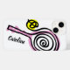 Design de gabinete do iPhone 14 personalizado para jogadores de tênis. Cobrir telefônico personalizado com design artístico de uma raquete de tênis cor-de-rosa e uma bola tênis amarela. Adicione o seu próprio nome, citação ou letras monográficas. Desenho de arte desportiva de raquete tênis. Presentes de aniversário personalizáveis para homens esportivos mulheres e crianças. Ideia elegante para jogador, fã e treinador. tipografia de script de pincel de na moda. Crie um para mãe, irmã, filha, amiga, companheira de equipe, dupla parceira, treinador, professor, avó, prima, menina etc. Acessórios S8 S7 para ela.