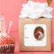 frango com chapéu de ervilha de jardim no adesivo de presente