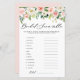 Adicione este divertido e festivo jogo de chá de panela personalizável ao seu evento. Apresenta terra floral de cor-de-água, rosas rosa e brancas, peonias e dahlias com sotaques verdes. Personalize esta trivia de chá de panela floral adicionando seus próprios textos. Este jogo de chá de panela de aquarela é perfeito para chás de panela de primavera e jardim.