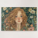 Esta bonito quebra-cabeça de serra apresenta uma garota com cabelo marrom emaranhado cercado por flores. Seria um belo presente para um entusiasta de quebra-cabeça que ama jardins.