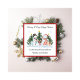 Este cartão de Natal é adequado para gêmeos no seu primeiro, segundo ou terceiro Natal. A design inclui um contorno vermelho, flocos de neve azuis-claros, árvores de Natal com aquarela, canas doces, presentes e bonecos gêmeos.