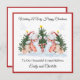 Este cartão de Natal é adequado para raparigas gêmeas no seu primeiro, segundo ou terceiro Natal. A design inclui um contorno vermelho, flocos de neve azuis-claros, árvores de Natal com aquarela, canas doces, presentes e bonecos gêmeos.