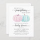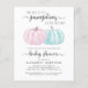 Uma garota e um garoto gêmeos bonitinhos e econômicos dirigem por chá de fraldas convidando com "Duas Pequenas Pumpkins Estão A Caminho" escrito em uma mistura de tipografia moderna de cinza mole e roteiro de na moda, e aquarelas de abóbora azul-rosa. Você pode personalizar o nome da mãe e dirigir por detalhes de chá em uma simples tipografia de cinza.
