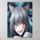 Retrato de uma menina de gato anime louca com cabelo de cinza e orelhas de gato, com um sorriso no rosto. Esta é uma arte gerada por IA.