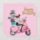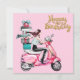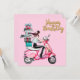 Uma garota cavalgando um carregando cor-de-rosa com muitos presentes.