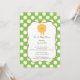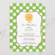 Um convite para Chás de fraldas de Páscoa doce com um pintinho de bebê giro, colocado sobre um fundo de bolinhas verde e branco. Disponível para meninas, meninos e gêmeos em nosso compro. Produtos correspondentes também estão disponíveis em nosso compro em www.celebrateitinvites.com. ©Zenware