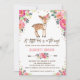 Convite para chá de fraldas de menina do tema Woodland apresentando ilustração adorável de um veado bebê cercado de folhagem verde rústica e de pincel de aquarela e de flores rosa quentes