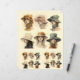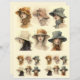 São apresentados vários retratos de mulheres que vestem diferentes estilos de chapéu, cada uma exibindo uma expressão e direção únicas de olhar. Os tons pastéis macios e detalhes intrincados, como as penas e os embelezamentos florais nos chapéus, dão um toque delicado e sofisticado aos retratos.