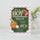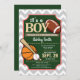 É um menino! Convite para chá de fraldas de garoto do tema desportivo. Convidar apresenta cinza e padrão de gíria branca com futebol, basquete e taco e bola de beisebol.