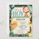 É um menino! O tema da selva tropical convite para chá de fraldas. O convite apresenta lindos leões, macacos, girafas, borboletas, abacaxi, aranha e folhas tropicais.