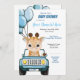 Garoto Chá de fraldas com Baby Giraffe no carro azul e balões para uma celebração de chá de fraldas (ideia de excelente para o tema do chá do urso Teddy).