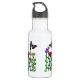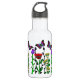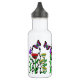 Bonito borboleta colorida e garrafa de água de flores rosa, roxa e amarela.
