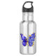 Borboleta de flores cinza, azul, safira, espumante com asa decorada com flores preciosos azuis com folhas de ouro sobre fundo branco.