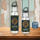 Crachá da crista Campbell rodeado por uma correia e fivela sobre fundo tartano. Texto personalizado.