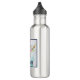 Uma garrafa de água personalizada com turquesa e fundo de água pastel. Um crânio bicho-papão com um buquê floral sobre sua cabeça e pequenas borboletas se espalhando.